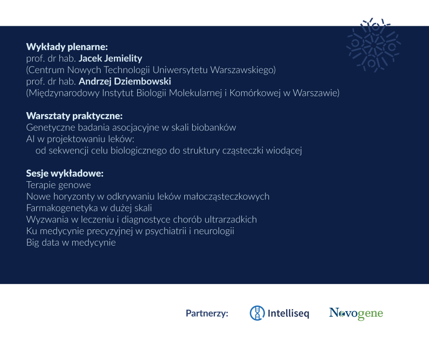 W programie wydarzenia znajdą się wykłady wybitnych specjalistów prowadzących badania podstawowe i kliniczne w obszarze personalizacji terapii, a także wystąpienia przedstawicieli organizacji pacjentów, którzy podzielą się doświadczeniami związanymi z diagnozowaniem i leczeniem chorób ultrarzadkich. Integralną częścią Szkoły będą również dwa warsztaty praktyczne: bioinformatyczny oraz cheminformatyczny.